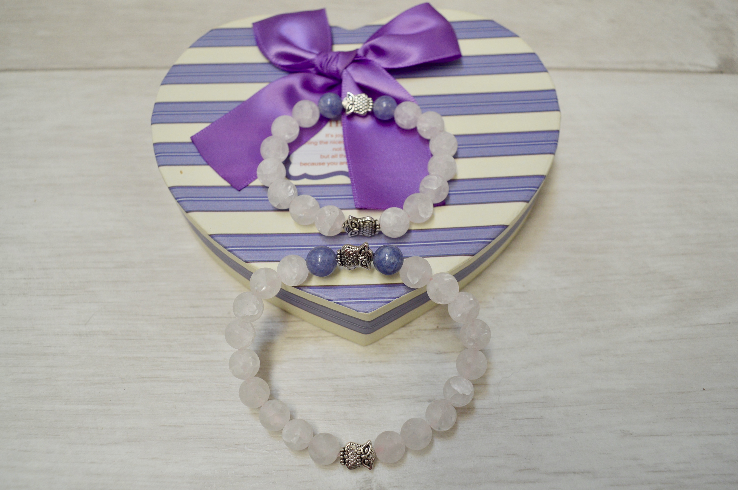 Matt hegyikristály-akvamarin ásványból álló karkötő,pici baglyos díszitéssel.