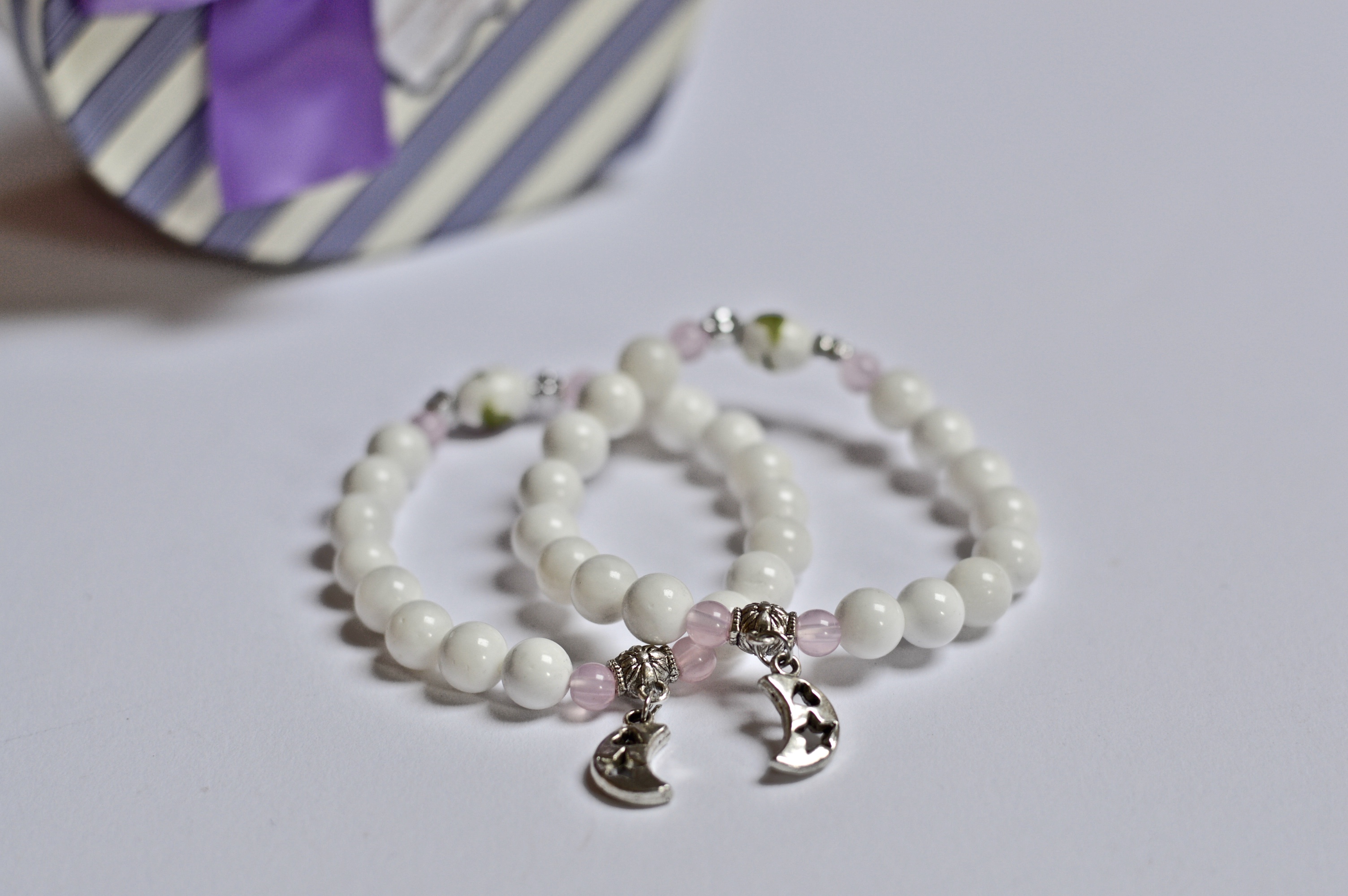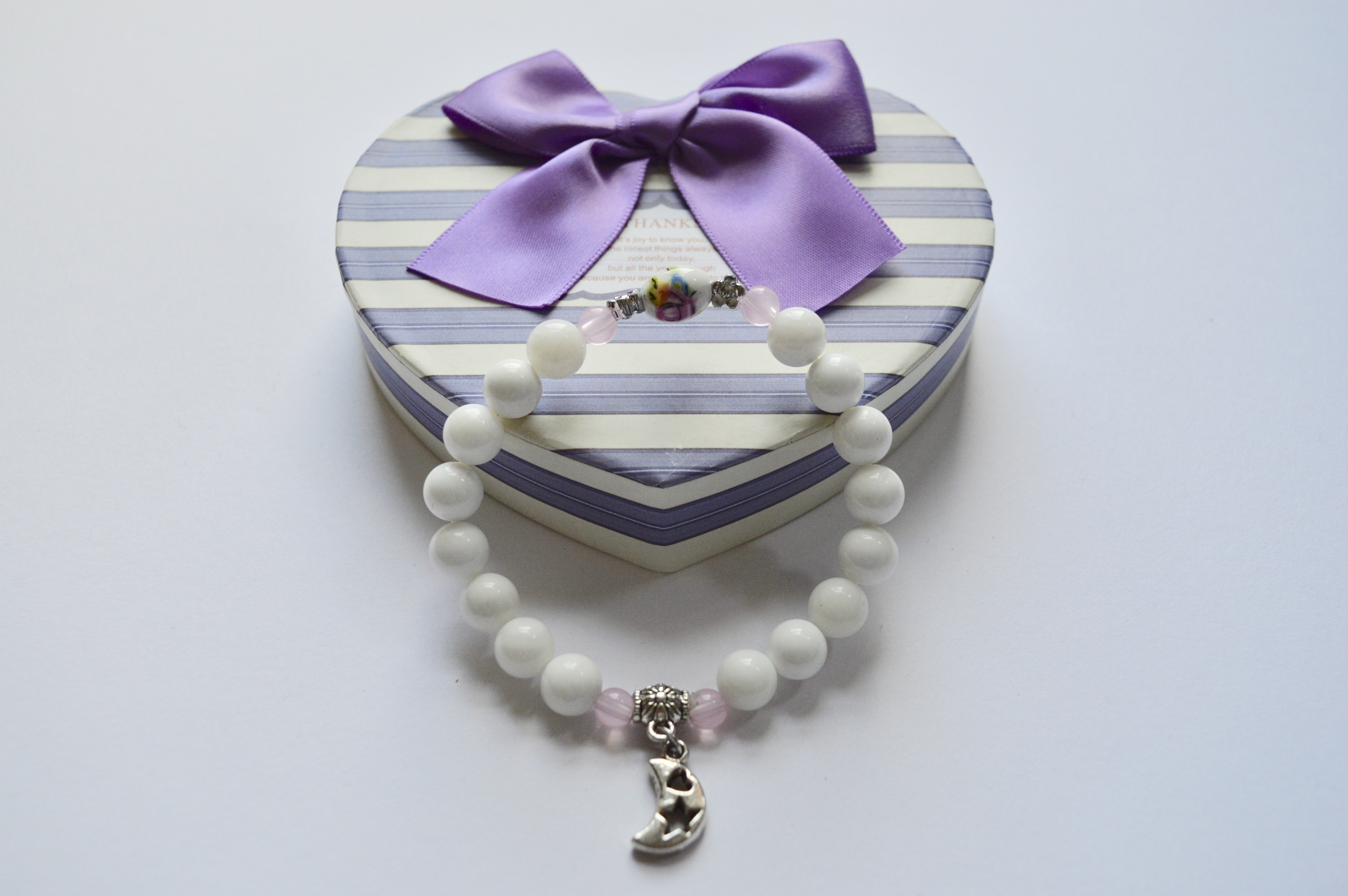 Ásvány karkötő ,fehér színű gyöngyökkel ,holdacska logóval.