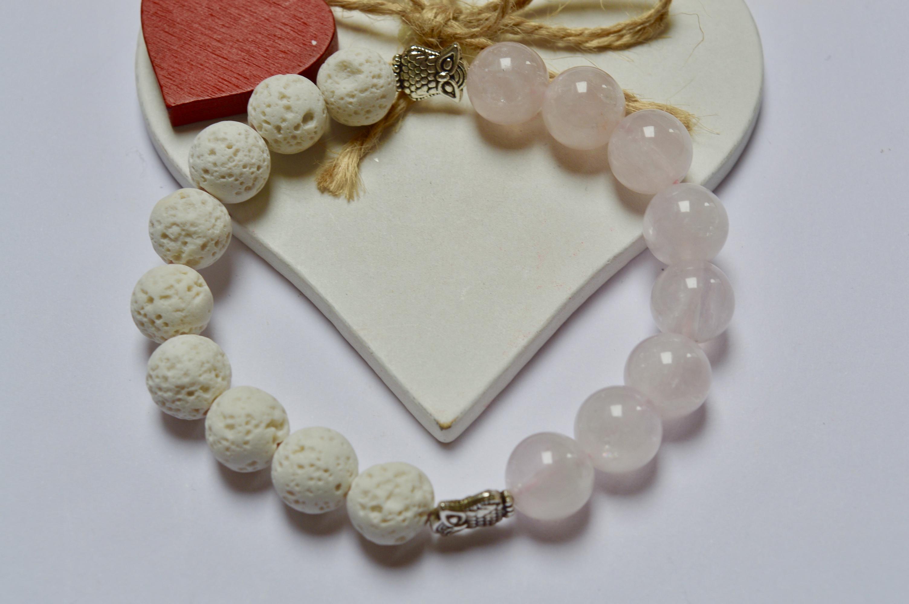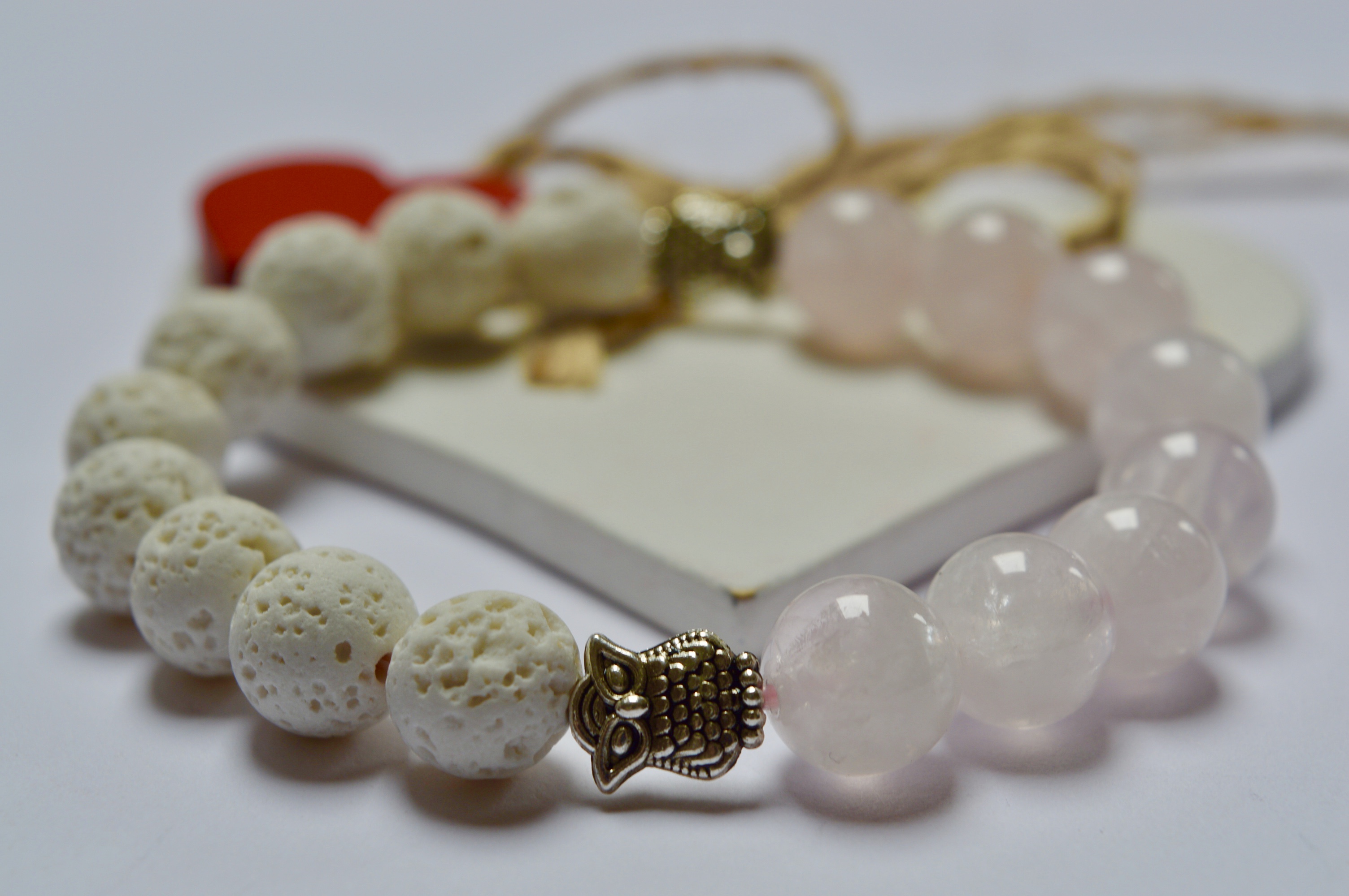 Rózsakvarc és bazalt ásványból készült karkötő ,pici baglyos díszítéssel.